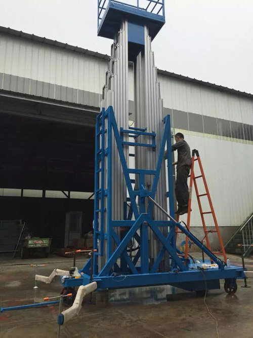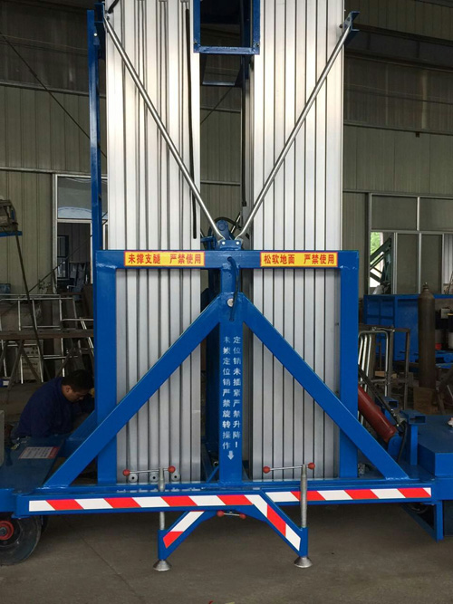 鋁合金升降機升高高度在8米以下為單跪柱式,在10米到14米之間為雙跪柱式,15米到18米之間則升為三跪柱式或四跪柱式。通過升降平臺跪柱的增加達到設備在高空的穩定性,保證作業安全,減小設備晃動的幅度,使高空作業更加平穩。該升降平臺配備了中德合資的液壓泵站,該泵站為壓鑄鋁集成閥塊,結構緊湊,系統壓力 16MPa,經過液壓泵站帶動鏈條傳動,結構合理,設計緊湊。鋁合金式液壓升降平臺下降速度可自調,而且設備設有手動下降裝置,保證在停電時的正常工作;設有應急停運按鈕;臺面設有防滑絕緣扣板,更換方便,易于清潔,維修方便,有效保障工作安全可靠,保證使用人員的安全。外形美觀,整體輕盈,能在小的空間內發揮好的舉升功能,也可根據客戶要求加裝蓄電池以滿足客戶工作場地的不同要求。